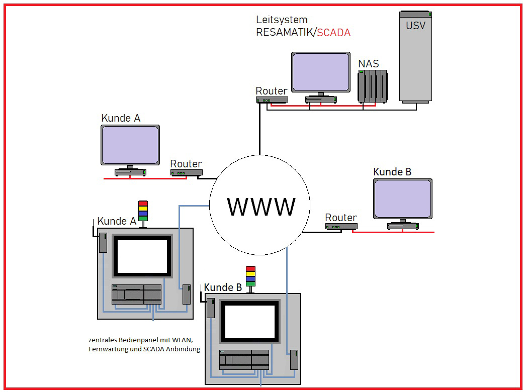 Unser zentrales SCADA System ist über unsere VPN-Tunnel 24/7 mit den Anlagen unserer Kunden verbunden. Anlagendaten werden gelesen und analysiert und unseren Kunden via Internet wieder zur Verfügung gestellt.